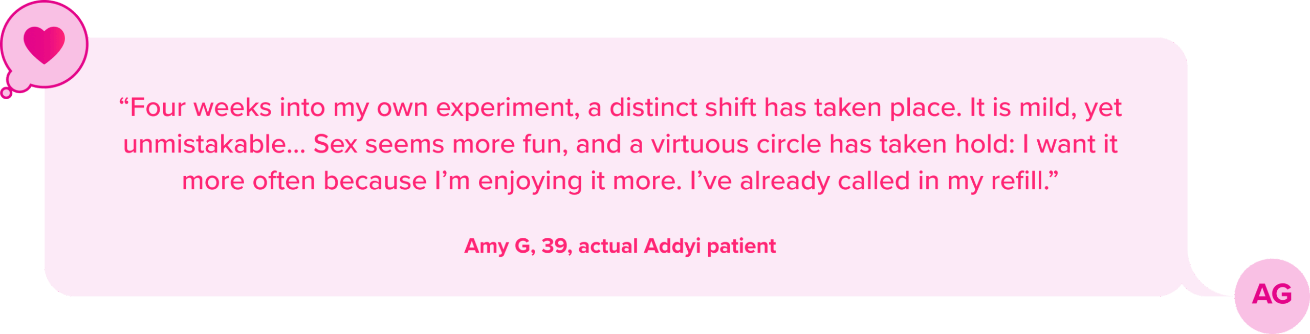 See full Prescribing Information, including Boxed Warning regarding severe low blood pressure and fainting in certain settings, and Medication Guide at addyi.com/pi.