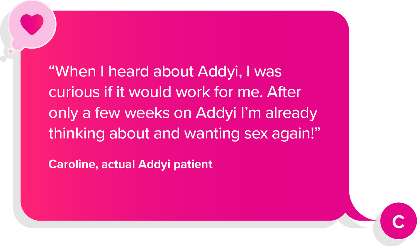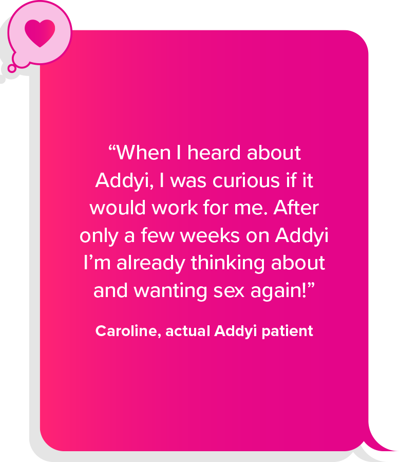 ADDYI is a prescription medicine used to treat hypoactive (low) sexual desire disorder (HSDD) in women who have not gone through menopause, who have not had problems with low sexual desire in the past, and who have low sexual desire no matter the type of sexual activity, the situation, or the sexual partner. Women with HSDD have low sexual desire that is troubling to them. Their low sexual desire is not due to: